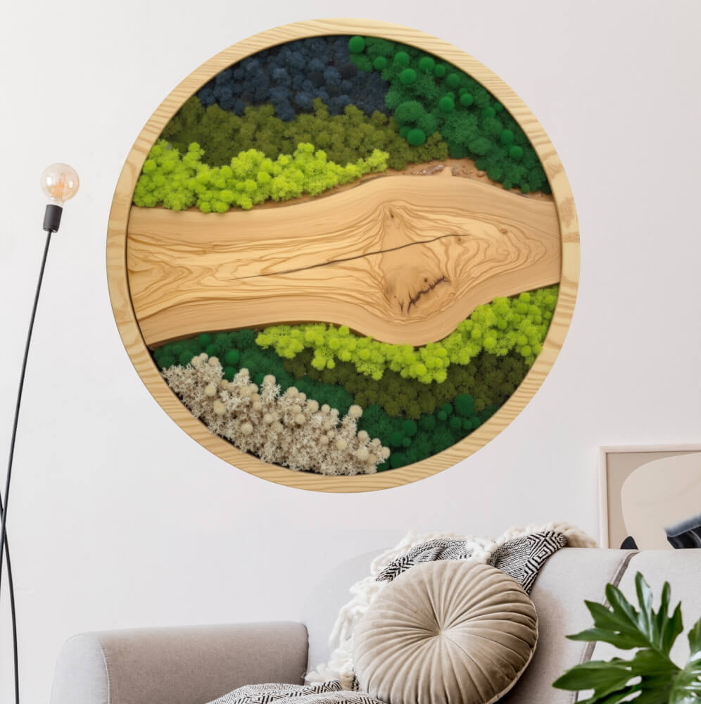 Samolepka s motívom rieky (imitácia dreva) obklopenej rôznymi druhmi a farbami machu (zelená, biela, modrá). Svetlý vzor rámu dodáva ľahkosť. Ideálne pre prírodne ladené interiéry.